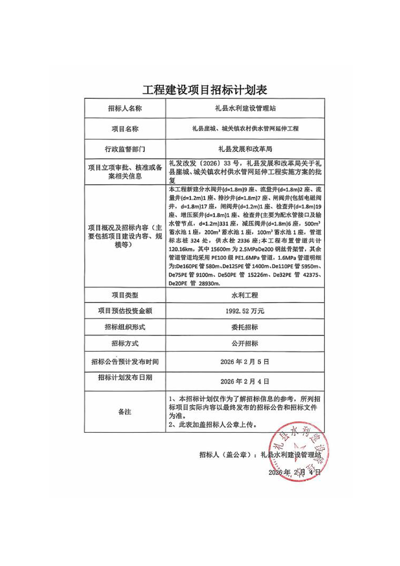 禮縣崖城、城關鎮(zhèn)農(nóng)村供水管網(wǎng)延伸工程