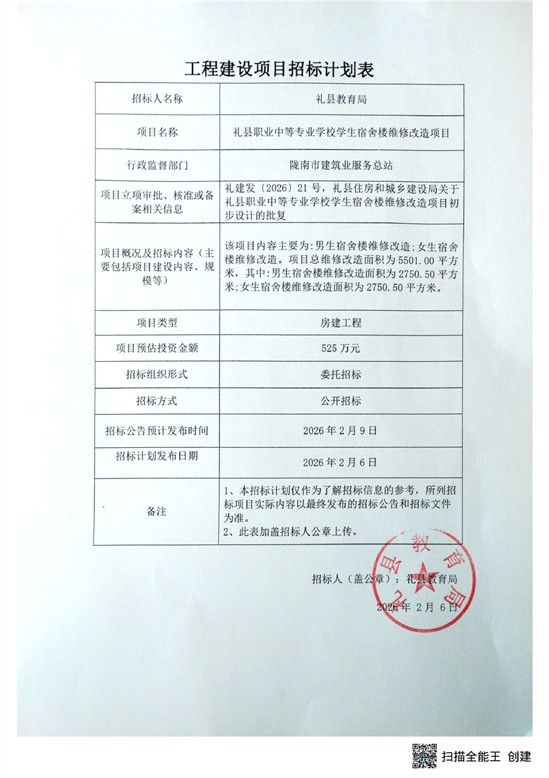 禮縣職業(yè)中等專(zhuān)業(yè)學(xué)校學(xué)生宿舍樓維修改造項(xiàng)目